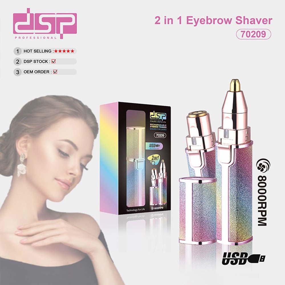 شیور زنانه مخصوص صورت و ابرو دی اس پی 70209 ویژگی محصول: دوکاره برای صورت و ابرو دارای سری قابل تعویض جنس تیغه استیل زد زنگ داراری دو سر ضد آب دارای دور موتور 8000 RPM (دور در دقیقه ) دارای برس تمیز کننده, راهنمای استفاده, سری موزن بینی و گوش, کابل شارژ شیور دیاسپی (بانوان) مدل 70209 شارژ USB توان: 2W باتری: Ni-MH ظرفیت باتری: AAA600mAh*1 زمان شارژ: 6 ساعت اجرا : 70 دقیقه